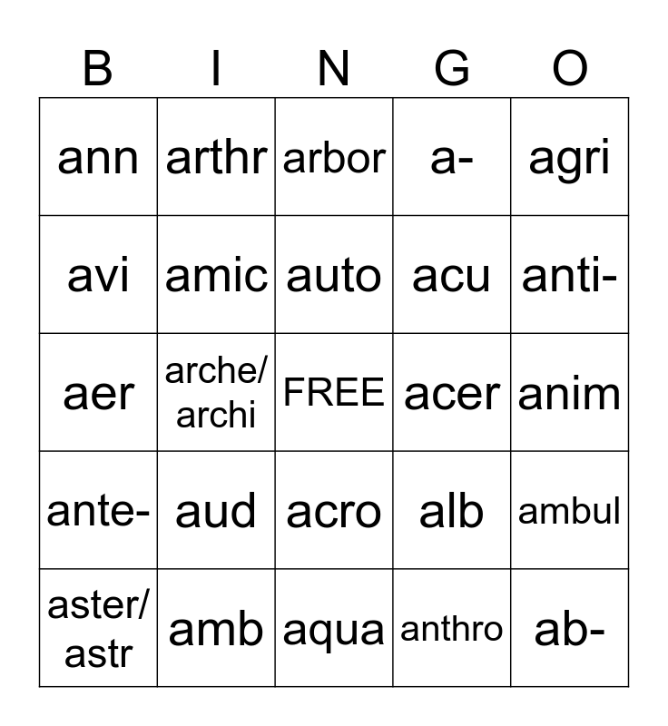 This bingo card has a free space and 24 words: aud, amb, auto, aster/ astr, agri, ann, avi, arthr, acer, acro, acu, aer, alb, ambul, amic, anthro, anim, arbor, anti-, arche/ archi, ab-, ante-, a- and aqua.