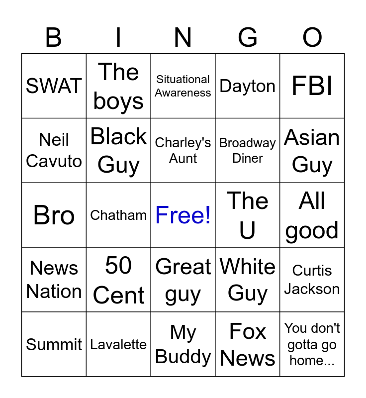 This bingo card has a free space and 24 words: 50 Cent, Lavalette, Charley's Aunt, Summit, FBI, SWAT, Neil Cavuto, The boys, The U, Great guy, Broadway Diner, Bro, White Guy, Curtis Jackson, Black Guy, Fox News, All good, Situational Awareness, Asian Guy, Chatham, You don't gotta go home..., News Nation, Dayton and My Buddy.