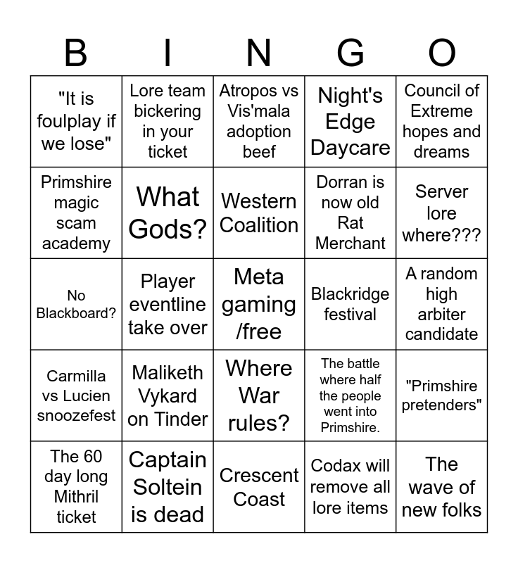 This bingo card has a free space and 24 words: Maliketh Vykard on Tinder, Captain Soltein is dead, Western Coalition, The 60 day long Mithril ticket, Council of Extreme hopes and dreams, "It is foulplay if we lose", Primshire magic scam academy, Lore team bickering in your ticket, Blackridge festival, Where War rules?, Dorran is now old Rat Merchant, No Blackboard?, The battle where half the people went into Primshire., "Primshire pretenders", What Gods?, Codax will remove all lore items, A random high arbiter candidate, Atropos vs Vis'mala adoption beef, Server lore where???, Player eventline take over, The wave of new folks, Carmilla vs Lucien snoozefest, Night's Edge Daycare and Crescent Coast.