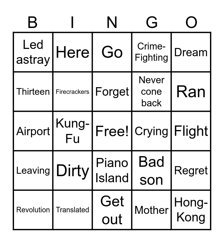 This bingo card has a free space and 39 words: First Light, Mao, Chairman, Firecrackers, Revolution, Piano Island, Forget, China, Dream, Leaving, Kung-Fu, Crime-Fighting, Hong-Kong, Flight, Crying, Dirty, Diseased, Led astray, Western devils, Bad son, Thirteen, Get out, Never cone back, Ran, Memories, No, Don’t touch me, Five years, Stroke, Here, Awful, Difficult, Go, Translated, Mother, Family, Regret, Airport and Severance.