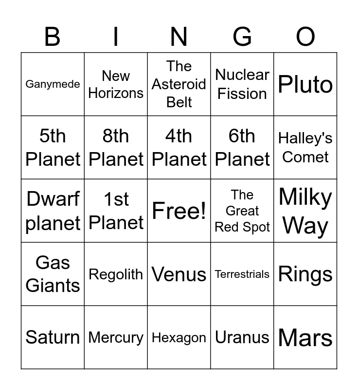 This bingo card has a free space and 43 words: Goldilocks Zone, Mars, Jupiter, Saturn, The Moon, Uranus, The Asteroid Belt, Neptune, Pluto, Mercury, Nuclear Fission, The Great Red Spot, Venus, Regolith, Magnetosphere, Hexagon, Orbit, Dwarf planet, Gravity, Halley's Comet, New Horizons, Great Dark Spot, Seasons, Ganymede, Uranus and Neptune, Milky Way, The Core, Comet, Terrestrials, Gas Giants, Rotation, Rings, A Day, 1st Planet, 2nd Planet, 1st Planet, 3rd Planet, 4th Planet, 5th Planet, 6th Planet, 7th Planet, 8th Planet and 9th Dwarf Planet.