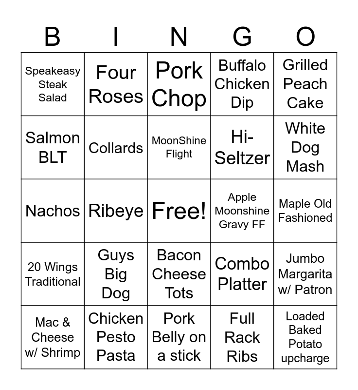 This bingo card has a free space and 24 words: Guys Big Dog, Chicken Pesto Pasta, MoonShine Flight, Mac & Cheese w/ Shrimp, Grilled Peach Cake, Speakeasy Steak Salad, Salmon BLT, Four Roses, Apple Moonshine Gravy FF, Bacon Cheese Tots, Hi-Seltzer, Nachos, Combo Platter, Jumbo Margarita w/ Patron, Collards, Full Rack Ribs, Maple Old Fashioned, Pork Chop, White Dog Mash, Ribeye, Loaded Baked Potato upcharge, 20 Wings Traditional, Buffalo Chicken Dip and Pork Belly on a stick.