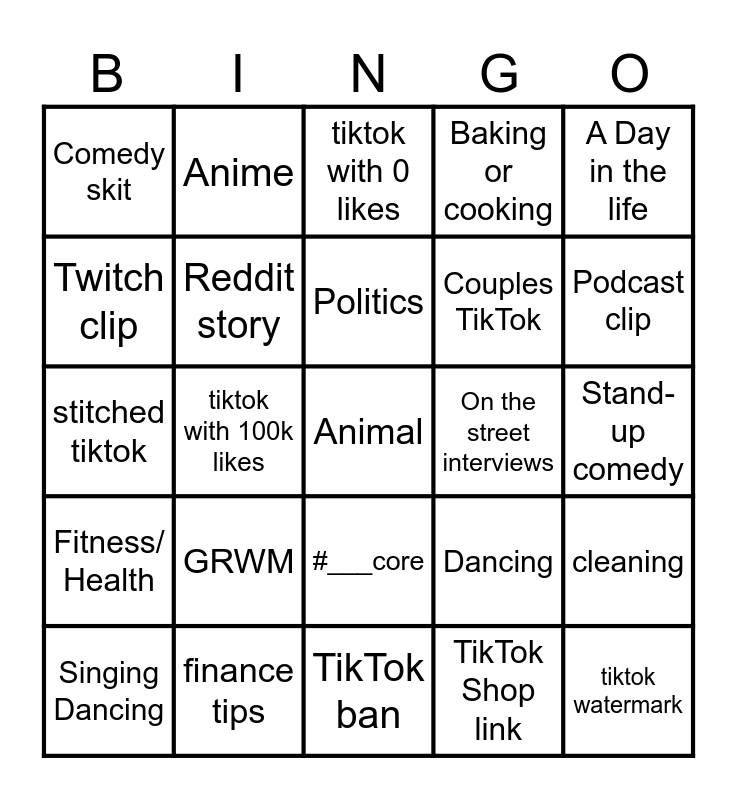 This bingo card has 25 words: GRWM, TikTok ban, Politics, Singing Dancing, A Day in the life, Comedy skit, Twitch clip, Anime, On the street interviews, #___core, Couples TikTok, stitched tiktok, Dancing, cleaning, Reddit story, tiktok watermark, Stand-up comedy, tiktok with 0 likes, Podcast clip, tiktok with 100k likes, Animal, finance tips, Fitness/ Health, Baking or cooking and TikTok Shop link.