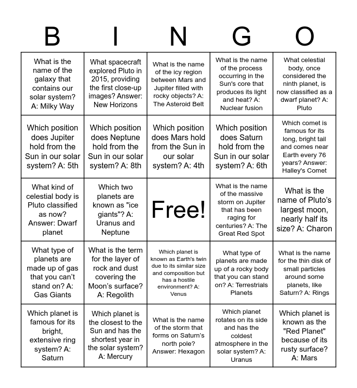 This bingo card has a free space and 44 words: What is the name of the zone around a star where liquid water can exist on a planet's surface? A: Goldilocks Zone, Which planet is known as the "Red Planet" because of its rusty surface? A: Mars, What is the largest planet in our solar system, known for its Great Red Spot? A: Jupiter, Which planet is famous for its bright, extensive ring system? A: Saturn, What is the only natural satellite of Earth? A: The Moon, Which planet rotates on its side and has the coldest atmosphere in the solar system? A: Uranus, What is the name of the icy region between Mars and Jupiter filled with rocky objects? A: The Asteroid Belt, Which planet has the fastest winds in the solar system, reaching speeds of up to 2,100 km/h? A: Neptune, What celestial body, once considered the ninth planet, is now classified as a dwarf planet? A: Pluto, Which planet is the closest to the Sun and has the shortest year in the solar system? A: Mercury, What is the name of the process occurring in the Sun's core that produces its light and heat? A: Nuclear fusion, What is the name of the massive storm on Jupiter that has been raging for centuries? A: The Great Red Spot, Which planet is known as Earth's twin due to its similar size and composition but has a hostile environment? A: Venus, What is the term for the layer of rock and dust covering the Moon’s surface? A: Regolith, What is the name of the Earth’s magnetic field that protects it from harmful solar winds? A: Magnetosphere, What is the name of the storm that forms on Saturn’s north pole? Answer: Hexagon, What term refers to the path a planet takes around the Sun? Answer: Orbit, What kind of celestial body is Pluto classified as now? Answer: Dwarf planet, What is the name of the force that keeps the planets in orbit around the Sun? Answer: Gravity, Which comet is famous for its long, bright tail and comes near Earth every 76 years? Answer: Halley's Comet, What spacecraft explored Pluto in 2015, providing the first close-up images? Answer: New Horizons, What is the name of the large storm on Neptune, similar to Jupiter's Great Red Spot? Answer: Great Dark Spot, What is the term for the phenomenon when a planet’s axial tilt causes different seasons? Answer: Seasons, What is the name of the galaxy that contains our solar system? A: Milky Way, What stream of charged particles flows outward from the Sun? A: Solar Wind, What is the name of Pluto’s largest moon, nearly half its size? A: Charon, Where does the Earth get its magnetic field from? A: The core, What is the term for a small body of rock and ice orbiting the Sun that develops a tail when near it? A: Comet, What type of planets are made up of a rocky body that you can stand on? A: Terrestrials Planets, What type of planets are made up of gas that you can’t stand on? A: Gas Giants, What is the term for the spinning motion of a planet on its axis? A: Rotation, What is the name for the thin disk of small particles around some planets, like Saturn? A: Rings, What term describes the time it takes a planet to complete one rotation on its axis? A: Day, What is the name of Jupiter's largest moon? A: Ganymede, Which two planets are known as "ice giants"? A: Uranus and Neptune, Which position does Mercury hold from the Sun in our solar system? A: 1st, Which position does Venus hold from the Sun in our solar system? A: 2nd, Which position does Earth hold from the Sun in our solar system? A: 3rd, Which position does Mars hold from the Sun in our solar system? A: 4th, Which position does Jupiter hold from the Sun in our solar system? A: 5th, Which position does Saturn hold from the Sun in our solar system? A: 6th, Which position does Uranus hold from the Sun in our solar system? A: 7th, Which position does Neptune hold from the Sun in our solar system? A: 8th and Which position does Pluto hold from the Sun in our solar system? A: 9th.