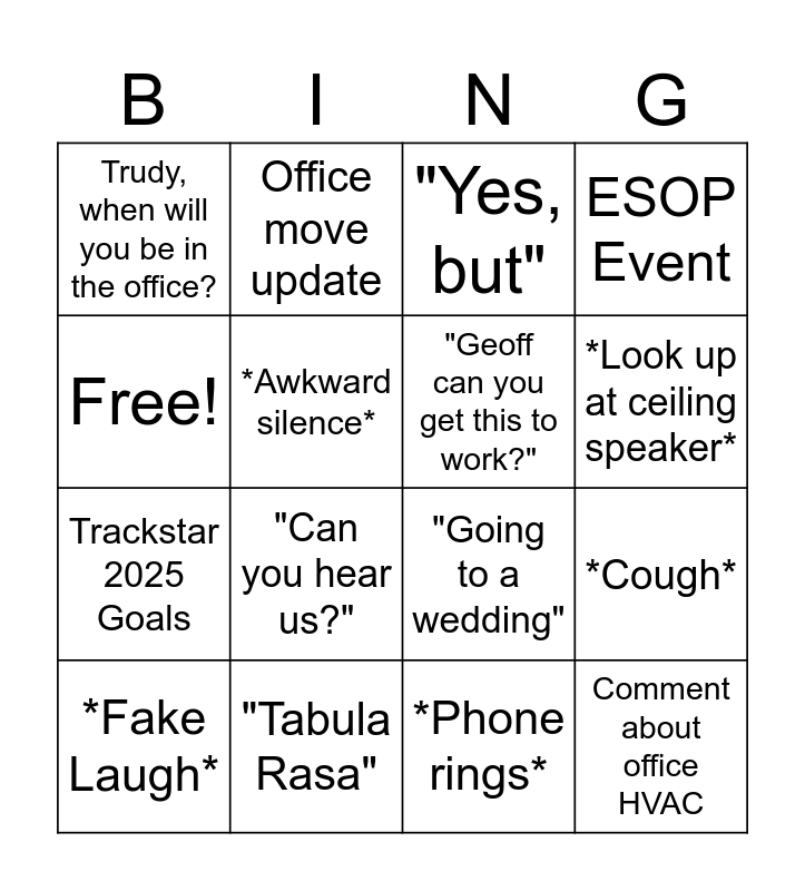 This bingo card has 16 words: "Tabula Rasa", *Cough*, "Yes, but", Trudy, when will you be in the office?, Trackstar 2025 Goals, Office move update, "Going to a wedding", *Phone rings*, Free!, *Awkward silence*, *Fake Laugh*, ESOP Event, "Can you hear us?", *Look up at ceiling speaker*, "Geoff can you get this to work?" and Comment about office HVAC.