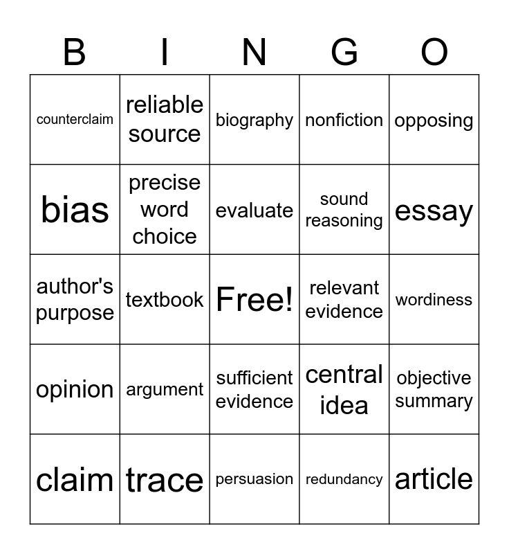 This bingo card has a free space and 24 words: argument, trace, evaluate, claim, opposing, counterclaim, bias, reliable source, relevant evidence, sufficient evidence, sound reasoning, author's purpose, central idea, objective summary, precise word choice, redundancy, wordiness, biography, essay, textbook, article, opinion, nonfiction and persuasion.