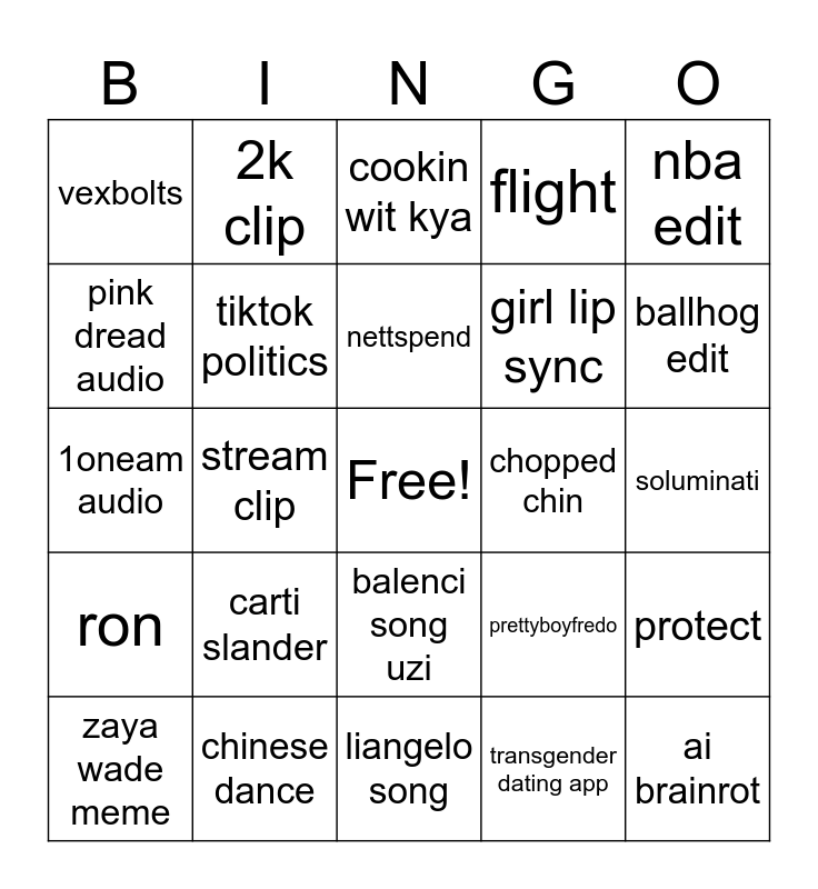This bingo card has a free space and 24 words: carti slander, chinese dance, nettspend, zaya wade meme, nba edit, vexbolts, pink dread audio, 2k clip, chopped chin, balenci song uzi, girl lip sync, 1oneam audio, prettyboyfredo, protect, tiktok politics, transgender dating app, soluminati, cookin wit kya, ballhog edit, stream clip, ai brainrot, ron, flight and liangelo song.