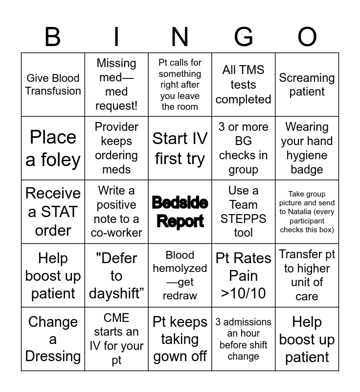 This bingo card has a free space and 24 words: "Defer to dayshift”, CME starts an IV for your pt, Start IV first try, Change a Dressing, Screaming patient, Give Blood Transfusion, Place a foley, Missing med—med request!, Use a Team STEPPS tool, Blood hemolyzed—get redraw, 3 or more BG checks in group, Receive a STAT order, Pt Rates Pain >10/10, Transfer pt to higher unit of care, Provider keeps ordering meds, 3 admissions an hour before shift change, Take group picture and send to Natalia (every participant checks this box), Pt calls for something right after you leave the room, Wearing your hand hygiene badge, Write a positive note to a co-worker, Help boost up patient, Help boost up patient, All TMS tests completed and Pt keeps taking gown off.