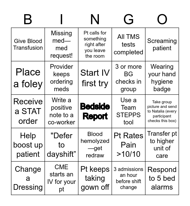 This bingo card has a free space and 24 words: "Defer to dayshift”, CME starts an IV for your pt, Start IV first try, Change a Dressing, Screaming patient, Give Blood Transfusion, Place a foley, Missing med—med request!, Use a Team STEPPS tool, Blood hemolyzed—get redraw, 3 or more BG checks in group, Receive a STAT order, Pt Rates Pain >10/10, Transfer pt to higher unit of care, Provider keeps ordering meds, 3 admissions an hour before shift change, Take group picture and send to Natalia (every participant checks this box), Pt calls for something right after you leave the room, Wearing your hand hygiene badge, Write a positive note to a co-worker, Respond to 5 bed alarms, Help boost up patient, All TMS tests completed and Pt keeps taking gown off.