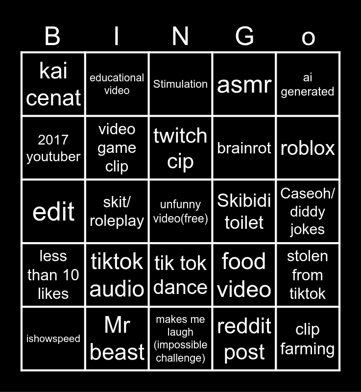 This bingo card has a free space and 24 words: tiktok audio, Mr beast, twitch cip, ishowspeed, ai generated, kai cenat, 2017 youtuber, educational video, Skibidi toilet, tik tok dance, brainrot, edit, food video, stolen from tiktok, video game clip, reddit post, Caseoh/ diddy jokes, Stimulation, roblox, skit/ roleplay, clip farming, less than 10 likes, asmr and makes me laugh (impossible challenge).
