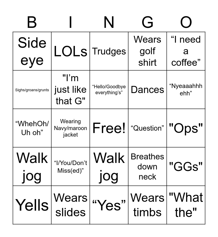 This bingo card has a free space and 24 words: “I/You/Don’t Miss(ed)”, Wears slides, “Hello/Goodbye everything’s”, Yells, “I need a coffee”, Side eye, Sighs/groans/grunts, LOLs, “Question”, Walk jog, Dances, “WhehOh/ Uh oh”, Breathes down neck, "GGs", "I’m just like that G", Wears timbs, "Ops", Trudges, “Nyeaaahhh ehh”, Wearing Navy/maroon jacket, "What the", Walk jog, Wears golf shirt and “Yes”.