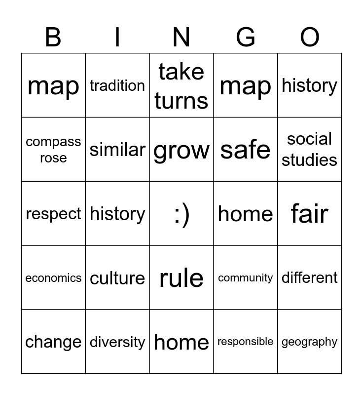 This bingo card has a free space and 24 words: culture, diversity, grow, change, history, map, compass rose, tradition, home, rule, safe, respect, community, different, similar, responsible, fair, take turns, social studies, history, geography, economics, map and home.
