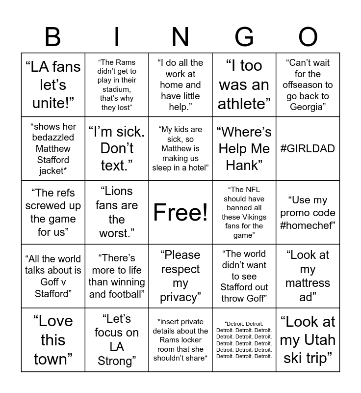 This bingo card has a free space and 24 words: “There’s more to life than winning and football”, “Let’s focus on LA Strong”, “My kids are sick, so Matthew is making us sleep in a hotel”, “Love this town”, “Can’t wait for the offseason to go back to Georgia”, “LA fans let’s unite!”, *shows her bedazzled Matthew Stafford jacket*, “The Rams didn’t get to play in their stadium, that’s why they lost”, “The NFL should have banned all these Vikings fans for the game”, “Please respect my privacy”, “Where’s Help Me Hank”, “The refs screwed up the game for us”, “The world didn’t want to see Stafford out throw Goff”, “Look at my mattress ad”, “I’m sick. Don’t text.”, “Detroit. Detroit. Detroit. Detroit. Detroit. Detroit. Detroit. Detroit. Detroit. Detroit. Detroit. Detroit. Detroit. Detroit. Detroit. Detroit. Detroit., “Use my promo code #homechef”, “I do all the work at home and have little help.”, #GIRLDAD, “Lions fans are the worst.”, “Look at my Utah ski trip”, “All the world talks about is Goff v Stafford”, “I too was an athlete” and *insert private details about the Rams locker room that she shouldn’t share*.