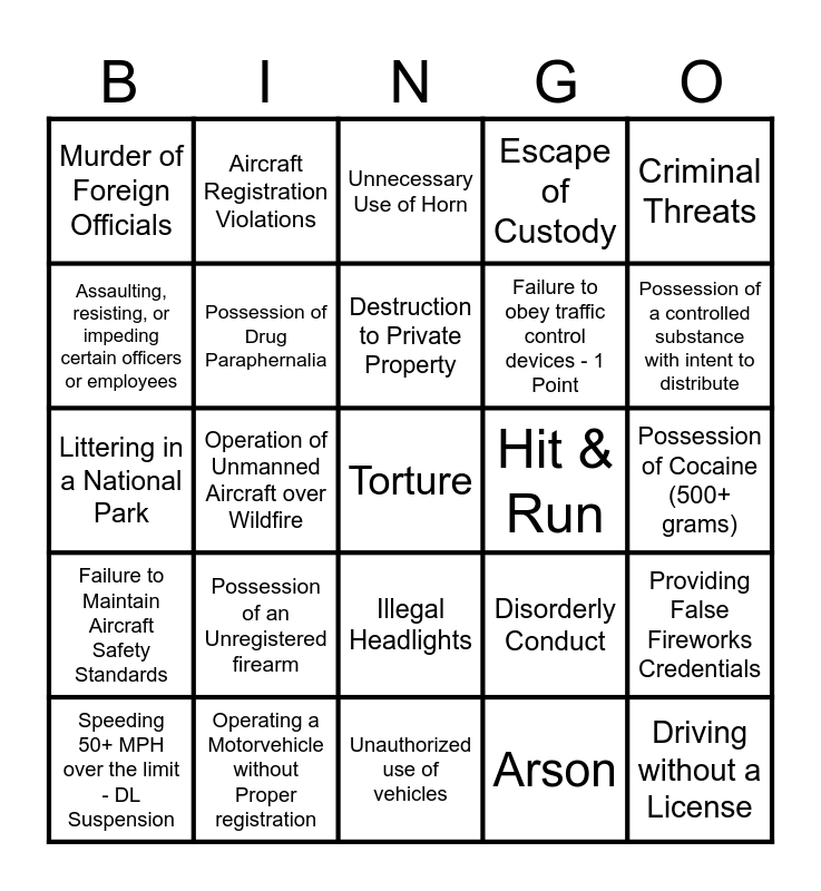 This bingo card has 252 words: 1st Degree Murder, 2nd Degree Murder, 3rd Degree Murder, Attempted Murder, Voluntary Manslaughter, Involuntary Manslaughter, Assault, Assault with a Deadly Weapon, Battery, Aggravated Battery, Indecent Expsure, Domestic Violence, Free!, Domestic Battery, False Imprisonment, Kidnapping, Kidnapping of a Public Worker, Torture, Human Trafficking, Criminal Threats, Violation of Restraining Order, Reckless Endangerment, Mayhem, Rigging Public Contests, Disorderly Conduct, Stalking, Harassment, Public Intoxication, Abuse of Corpse, Failure to register Citizenship, Criminal Gang Affiliation, Improper Disposal of Body, Vehicular Manslaughter, Arson, Criminal Mischief, Reckless Damage or Destruction, Robbery, Aggravated Robbery, Burglary, Grand Theft Auto, Carjacking, Criminal Tresspass, Tresspassing within a restricted facility, Possession of Stolen Property, Selling Stolen Property, Unauthorized use of vehicles, Vandalism, Forgery, Loitering, False Statement to obtain Property, Damage to Government Property, Destruction of Government Property, Destruction of Traffic Control Device(s), Destruction to Private Property, Theft of Traffic Control Device, Unintentional Cause of a Fire, Tampering with Evidence, Tampering with Witness, Tampering with Government Records, False Police Report, Failure to comply as a witness, Perjury, Contempt of Court, Failure to pay Fine, Failure to appear in Court, Providing False information, Failure to provide an ID, Failure to abide by a lawful command, Resisting Arrest, Interfering with a Search & Seizure, Obstruction of Justice, Fleeing & Elluding, Escape of Custody, Bribery, Accessory after the fact, Accessory during the crime, Impersonating a Government Official, Assault on Law Enforcement, Battery of a Peace Officer, Attempted Murder of a Peace Officer, Murder of a Peace Officer, Failure to provide breath/blood sample, Lying on a State Record, Vigilantism, Faillure to give a Breath Sample, Fraud, Interfering with a Fire Marshall, Assault of Fire Personnel, Battery of Fire Personnel, Attempted Murder of Fire Personnel, Murder of a Fire Personnel, Unlawful Concealed Carry, Unlawful Carry of a Firearm in a Restricted Area, Violent Felon in possession of a firearm, Felon in possession of body armor, Possession of a prohibited weapon, Unlawful transfer or gain of a firearm, Unlawful Display of a Firearm, Unlawful Discharge of a Firearm, Discharging a firearm on a roadway, Possession of a highly dangerous device, Possession of an Unregistered firearm, Distributation of a firearm without proper license, Possession of an illegal weapon, Possession of a controlled substance, Possession of a controlled substance with intent to distribute, Distribution of a controlled substance, Possession of Drug Paraphernalia, Criminal Possession of marijuana, Criminal Distributation of marijuana, Conspiracy to Commit, Administrating Chemical Agents to other people, Possession of a Firearm while Under the Influence, Failure to Provide Federal Firearm License, Distribution of Illegal Fireworks to a Minor, Distribution of Illegal Fireworks, Possession of 0-24 LBS Illegal Fireworks, Possession of 25-100 Pounds of Illegal Fireworks, Possession of 101-5000 LBS Illegal Fireworks, Possession of more than 5000 LBS of Illegal Fireworks, Providing False Fireworks Credentials, Production of Illegal Fireworks, Discharge of Illegal Fireworks Within City Limits, Discharge of Illegal Fireworks within a National Park, Use of Fireworks while under the influence, Unlicensed Distribution of Fireworks, Tampering with Firework Seals, Forgering of Legal Documents, Unsafe Transportation of Fireworks, Obstruction of Medical Care, Drug Trafficking, Possession of Cocaine (1-99 grams), Possession of Cocacine (100-499 grams), Possession of Cocaine (500+ grams), Possession of Fentanyl (1-99 grams), Possession of Fentanyl (100-499 grams), Possession of Fentanyl (500+ grams), Possession of Heroin (0-199 grams), Possession of heroin (200-499 grams), Possession of Heroin (500+ grams), Taking or attempting to take a weapon from a peace officer, Violent Felon Found to be in Constructive Possession of a Firearm, Possession of a Firearm during the Commission of a Crime, Animal Abuse, Hunting on Probation, Exceeding Hunting hours, Illegal Hunting Methods, Hunting under the influence, Poaching, Hunting endangered species, Hunting/Fishing on Expired/Suspended/Revoked or no License, Operating ATV on walking trails, Hunting without Hunter Orange on vehicle, Operating an All-Terrain Vehicle with a Passenger, Operating an All-Terrain Vehicle within a Stream or River, Operating Water Vehicle while under the Influence, Exceeding allowed hunting limits, Vandalism of a National Park, Destruction of a National Park, Littering in a National Park, Injuring an endangered animal, Removing Endangered animals from natural habitat, Operating a Motorvehicle without Proper registration, Driving without a License, Driving with a Suspended/Revoked/Expired License, Driving with expired tags & registration, Speeding 1+ MPH over the limit - 1 Point, Speeding 15+ MPH over the limit - 1 Point, Speeding 30+ MPH over the limit - 2 Point, Speeding 50+ MPH over the limit - DL Suspension, Failure to display headlights, Operating a motor vehicle with unsecure passengers, Reckless driving - 3 Points, Failure to maintain lanes - 1 Point, Illegal overtake - 1 Point, Illegal U-Turn, Failure to Yield right of way, Failure to obey traffic control devices - 1 Point, Obstructing Highway or Passageway, Unnecessary Use of Horn, Window Tint Violation, Illegal Headlights, Illegal Underglow, Hit & Run, License Plate Violation, Driving Under the Influence - 6 Points on License, Illegal Parking, Driving an unroadworthy vehicle, Failure to Yield to Pedestrian, Following too Closely, Operating a Motorcycle without a Helmet, Failure to Yield to an Emergency Vehicle, Operating an All-Terrain Vehicle on a Roadway/Highway, Operating a CMV on a wei