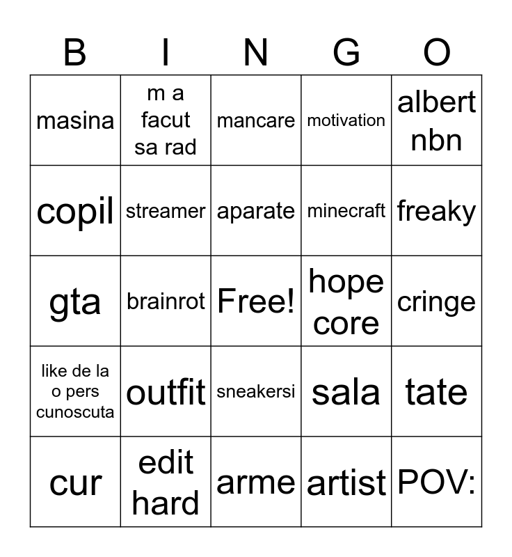 This bingo card has a free space and 24 words: outfit, edit hard, aparate, cur, albert nbn, masina, copil, m a facut sa rad, hope core, sneakersi, minecraft, gta, sala, tate, streamer, artist, cringe, mancare, freaky, brainrot, POV:, like de la o pers cunoscuta, motivation and arme.