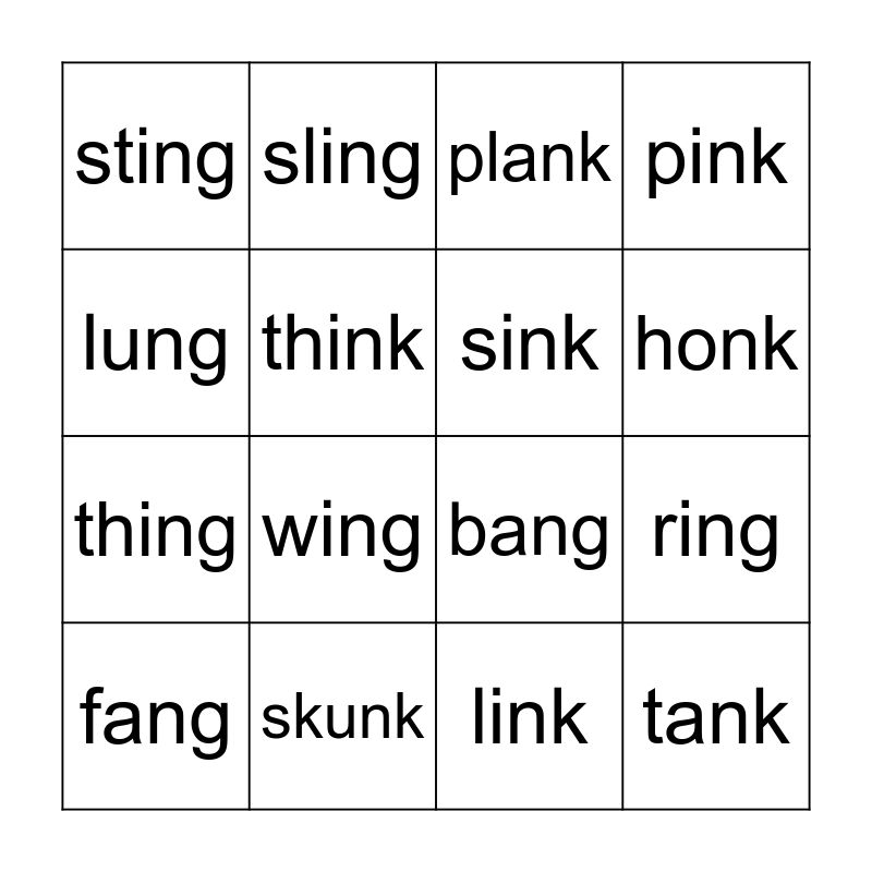 This bingo card has 25 words: trunk, gong, bang, strong, sting, sling, plank, pink, thing, wing, link, ring, sing, skunk, sink, king, fang, think, bonk, tank, lung, wink, swing, honk and bunk.