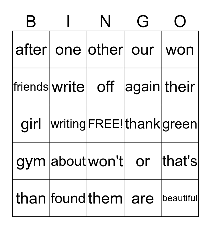 This bingo card has a free space and 24 words: about, found, off, than, won, after, friends, one, thank, won't, again, girl, or, that's, write, are, green, other, their, writing, beautiful, gym, our and them.