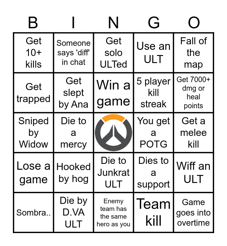 This bingo card has a free space and 24 words: Hooked by hog, Die by D.VA ULT, Win a game, Sombra.., Fall of the map, Get 10+ kills, Get trapped, Someone says 'diff' in chat, You get a POTG, Die to Junkrat ULT, 5 player kill streak, Sniped by Widow, Dies to a support, Wiff an ULT, Get slept by Ana, Team kill, Get a melee kill, Get solo ULTed, Get 7000+ dmg or heal points, Die to a mercy, Game goes into overtime, Lose a game, Use an ULT and Enemy team has the same hero as you.