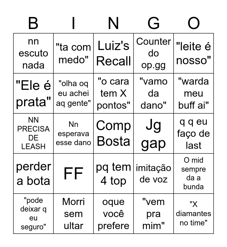 This bingo card has a free space and 24 words: FF, Morri sem ultar, "o cara tem X pontos", "pode deixar q eu seguro", "leite é nosso", nn escuto nada, "Ele é prata", "ta com medo", Jg gap, pq tem 4 top, "vamo da dano", NN PRECISA DE LEASH, imitação de voz, O mid sempre da a bunda, "olha oq eu achei aq gente", "vem pra mim", q q eu faço de last, Luiz's Recall, "warda meu buff ai", Nn esperava esse dano, "X diamantes no time", perder a bota, Counter do op.gg and oque você prefere.