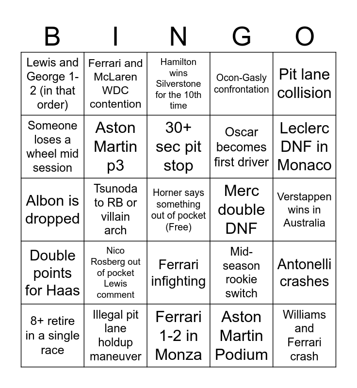 This bingo card has a free space and 24 words: Nico Rosberg out of pocket Lewis comment, Illegal pit lane holdup maneuver, 30+ sec pit stop, 8+ retire in a single race, Pit lane collision, Lewis and George 1-2 (in that order), Someone loses a wheel mid session, Ferrari and McLaren WDC contention, Merc double DNF, Ferrari infighting, Oscar becomes first driver, Albon is dropped, Mid-season rookie switch, Antonelli crashes, Aston Martin p3, Aston Martin Podium, Verstappen wins in Australia, Hamilton wins Silverstone for the 10th time, Leclerc DNF in Monaco, Tsunoda to RB or villain arch, Williams and Ferrari crash, Double points for Haas, Ocon-Gasly confrontation and Ferrari 1-2 in Monza.