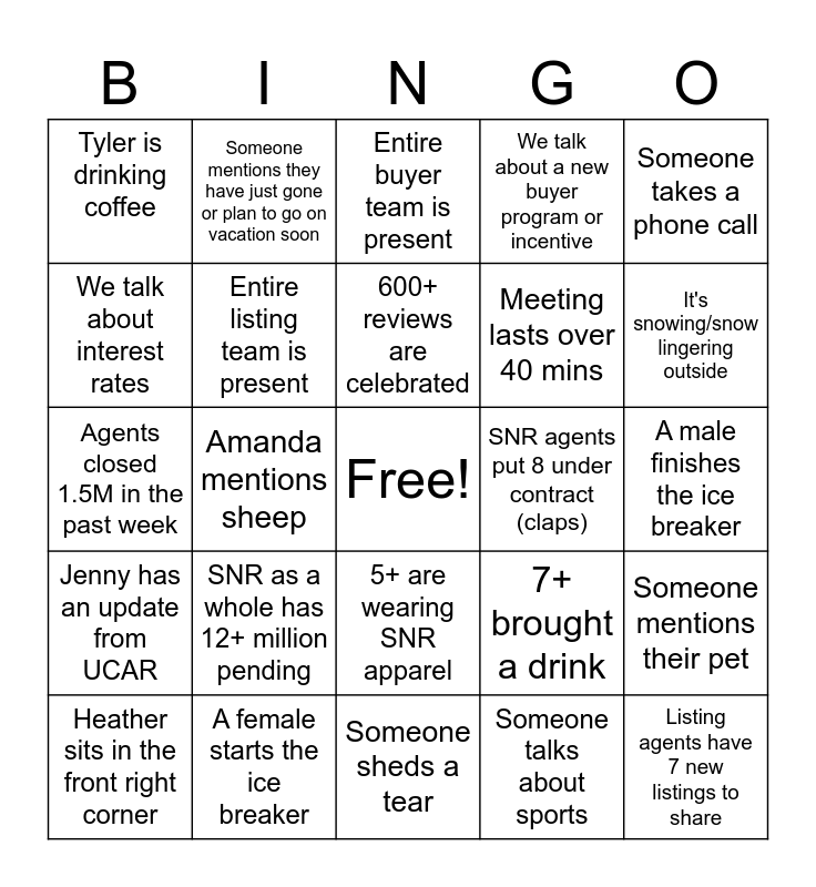 This bingo card has a free space and 29 words: Heather sits in the front right corner, JR, Michelle, and Lindsey sit by each other, Amanda mentions sheep, Trevor is wearing camo, Tyler is drinking coffee, Entire buyer team is present, Entire listing team is present, SNR as a whole has 12+ million pending, SNR agents put 8 under contract (claps), A female starts the ice breaker, A male finishes the ice breaker, Listing agents have 7 new listings to share, Someone sheds a tear, Someone talks about sports, It's snowing/snow lingering outside, Brandi is wearing pink, 5+ are wearing SNR apparel, Jenny has an update from UCAR, Someone takes a phone call, Agents closed 1.5M in the past week, 7+ brought a drink, Someone brought their breakfast to the meeting, Meeting lasts over 40 mins, We talk about interest rates, We talk about a new buyer program or incentive, Someone mentions they have just gone or plan to go on vacation soon, Someone mentions their pet, 600+ reviews are celebrated and We are shown something on the TV.