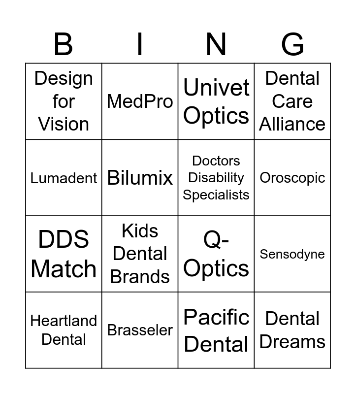 This bingo card has 18 words: Kids Dental Brands, Dental Dreams, Univet Optics, Design for Vision, Q-Optics, Dental Care Alliance, Heartland Dental, MedPro, Oroscopic, DDS Match, Pacific Dental, Lumadent, Sensodyne, Bilumix, Doctors Disability Specialists, Ninth District, Brasseler and NYSDA.