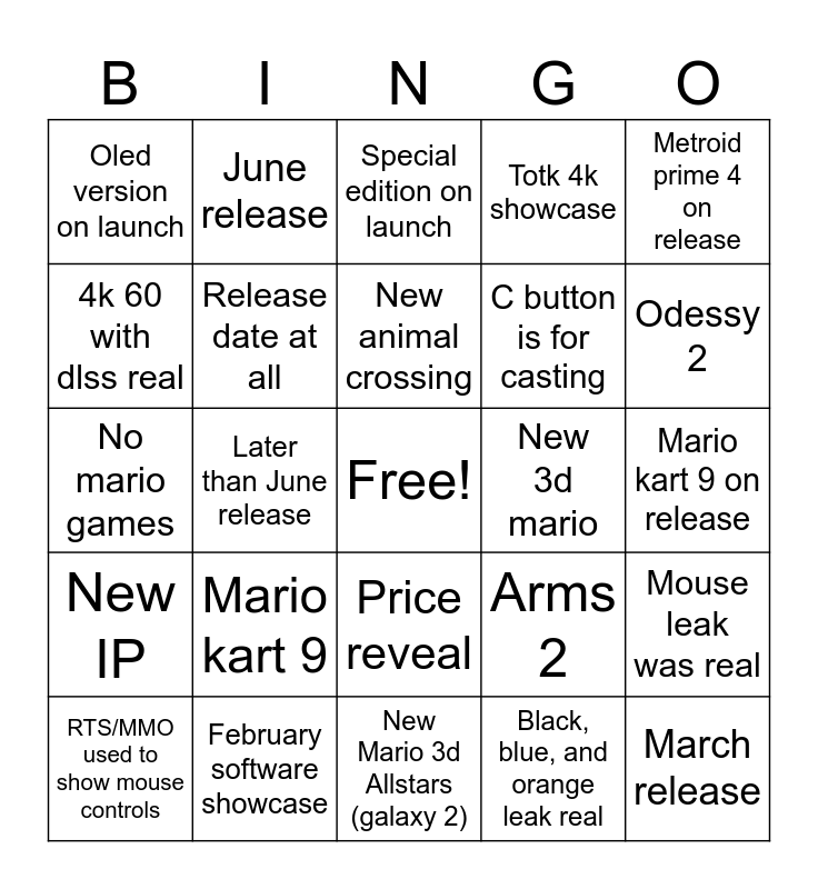 This bingo card has a free space and 24 words: Mario kart 9, February software showcase, New animal crossing, RTS/MMO used to show mouse controls, Metroid prime 4 on release, Oled version on launch, 4k 60 with dlss real, June release, New 3d mario, Price reveal, C button is for casting, No mario games, Arms 2, Mouse leak was real, Release date at all, Black, blue, and orange leak real, Mario kart 9 on release, Special edition on launch, Odessy 2, Later than June release, March release, New IP, Totk 4k showcase and New Mario 3d Allstars (galaxy 2).
