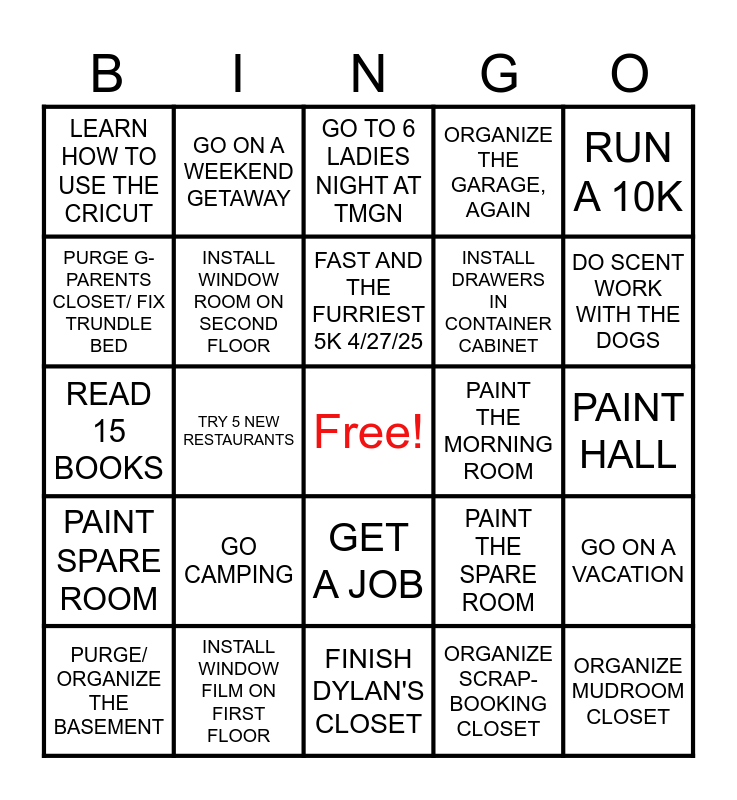 This bingo card has a free space and 24 words: GO CAMPING, INSTALL WINDOW FILM ON FIRST FLOOR, FAST AND THE FURRIEST 5K 4/27/25, PURGE/ ORGANIZE THE BASEMENT, RUN A 10K, LEARN HOW TO USE THE CRICUT, PURGE G-PARENTS CLOSET/ FIX TRUNDLE BED, GO ON A WEEKEND GETAWAY, PAINT THE MORNING ROOM, GET A JOB, INSTALL DRAWERS IN CONTAINER CABINET, READ 15 BOOKS, PAINT THE SPARE ROOM, GO ON A VACATION, INSTALL WINDOW ROOM ON SECOND FLOOR, ORGANIZE SCRAP-BOOKING CLOSET, PAINT HALL, GO TO 6 LADIES NIGHT AT TMGN, DO SCENT WORK WITH THE DOGS, TRY 5 NEW RESTAURANTS, ORGANIZE MUDROOM CLOSET, PAINT SPARE ROOM, ORGANIZE THE GARAGE, AGAIN and FINISH DYLAN'S CLOSET.