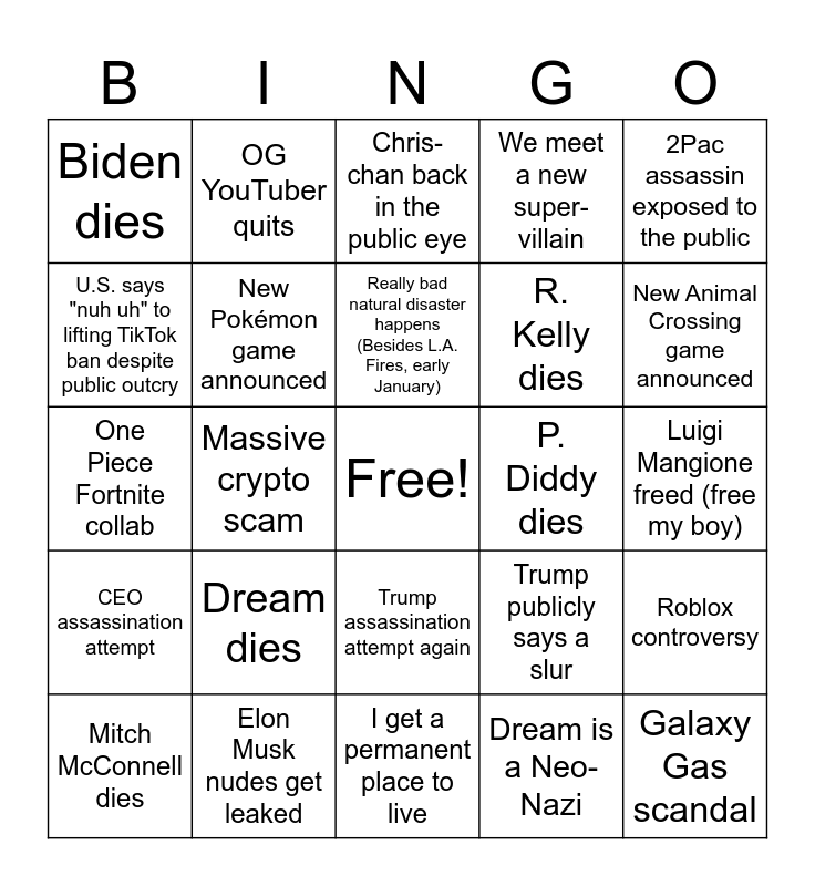 This bingo card has a free space and 24 words: Dream dies, Elon Musk nudes get leaked, Really bad natural disaster happens (Besides L.A. Fires, early January), Mitch McConnell dies, 2Pac assassin exposed to the public, Biden dies, U.S. says "nuh uh" to lifting TikTok ban despite public outcry, OG YouTuber quits, P. Diddy dies, Trump assassination attempt again, R. Kelly dies, One Piece Fortnite collab, Trump publicly says a slur, Roblox controversy, New Pokémon game announced, Dream is a Neo-Nazi, Luigi Mangione freed (free my boy), Chris-chan back in the public eye, New Animal Crossing game announced, Massive crypto scam, Galaxy Gas scandal, CEO assassination attempt, We meet a new super-villain and I get a permanent place to live.