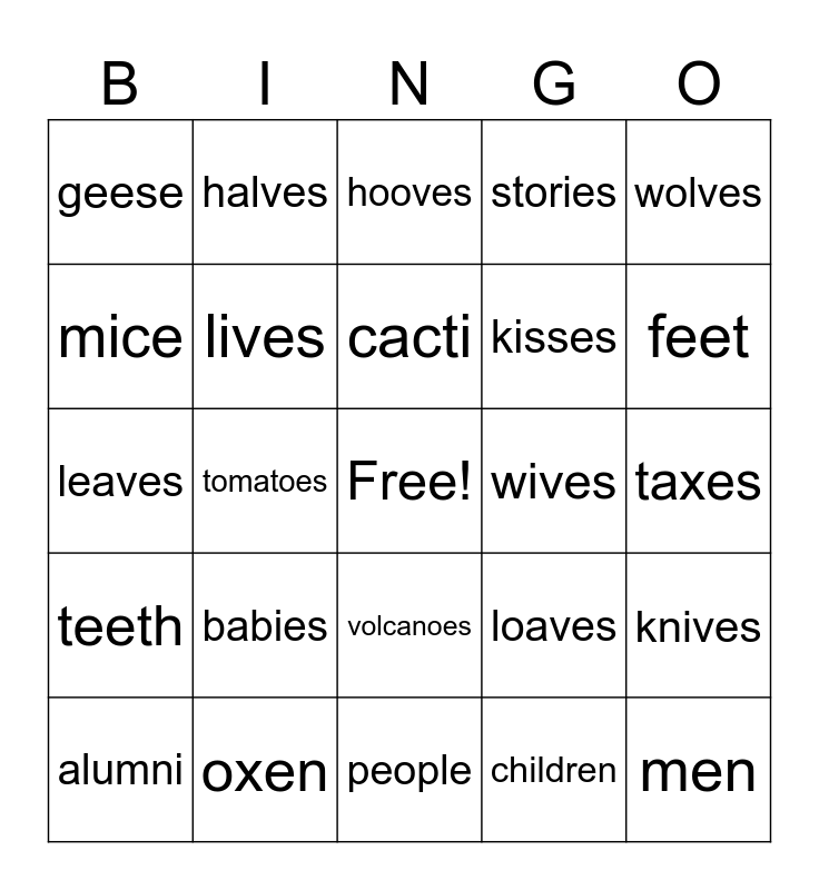This bingo card has a free space and 25 words: alumni, babies, cacti, children, feet, geese, halves, hooves, kisses, knives, leaves, lives, loaves, men, mice, oxen, people, stories, taxes, teeth, tomatoes, volcanoes, wives, wolves and alumni.