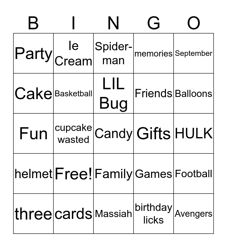 This bingo card has 25 words: Free!, Massiah, LIL Bug, three, September, Party, Cake, Ie Cream, Gifts, Family, Friends, Fun, Games, Football, Basketball, Avengers, HULK, Spider-man, Balloons, cupcake wasted, Candy, cards, helmet, memories and birthday licks.