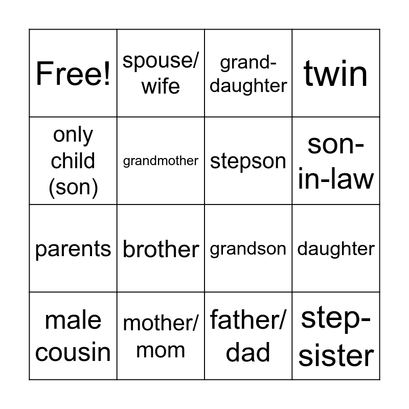 This bingo card has 41 words: spouse/ husband, spouse/ wife, son, daughter, parents, mother/ mom, father/ dad, siblings, Free!, brother, sister, twin, only child (son), grandmother, grandfather, great grandmother, only child (daughter), grand-daughter, aunts & uncles, grandson, aunt, male cousin, female cousin, niece, uncle, step-mother, step-father, step-siblings, step-sister, nephew, step-children, stepson, step-daughter, step-brother, daughter-in-law, son-in-law, mother-in-law, father-in-law, relative, brother-in-law and sister-in-law.