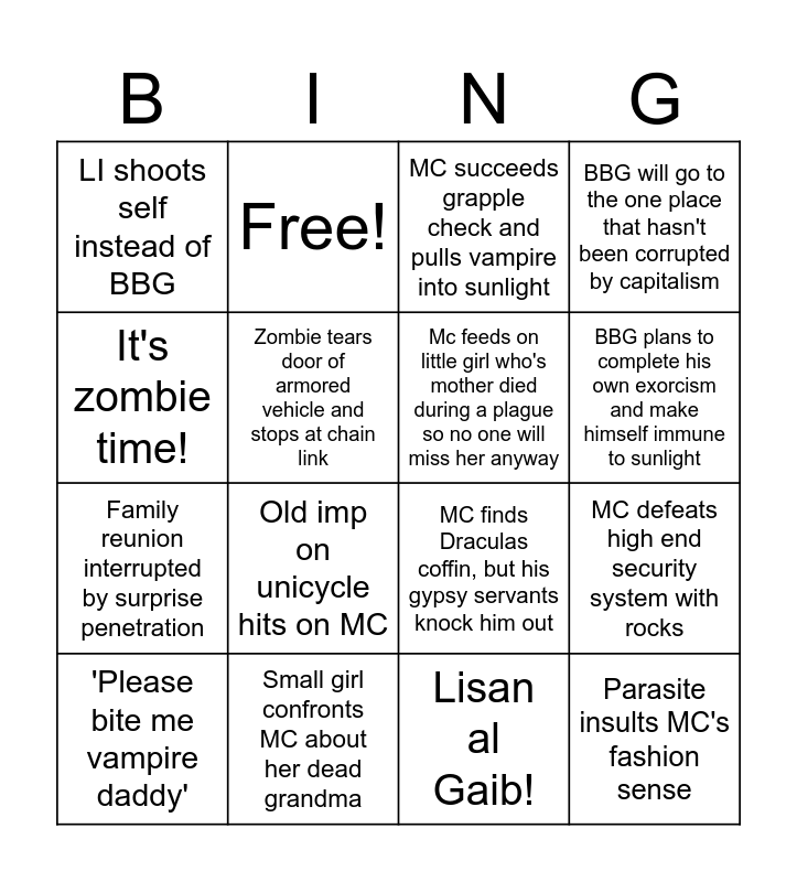 This bingo card has 16 words: Small girl confronts MC about her dead grandma, MC defeats high end security system with rocks, MC succeeds grapple check and pulls vampire into sunlight, LI shoots self instead of BBG, Family reunion interrupted by surprise penetration, Free!, MC finds Draculas coffin, but his gypsy servants knock him out, Lisan al Gaib!, It's zombie time!, Zombie tears door of armored vehicle and stops at chain link, 'Please bite me vampire daddy', BBG will go to the one place that hasn't been corrupted by capitalism, Old imp on unicycle hits on MC, BBG plans to complete his own exorcism and make himself immune to sunlight, Mc feeds on little girl who's mother died during a plague so no one will miss her anyway and Parasite insults MC's fashion sense.