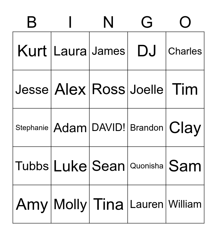 This bingo card has a free space and 37 words: Caleb, Eric, TJ, Alex, Sam, Luke, Ross, Pete, Charles, Chris, Adam, DJ, William, Clay, Jesse, Tubbs, Storey, James, Sean, Brandon, Kurt, Tim, Amy, Tina, Caitlin, Lauren, Laura, Kate W, Kate D, Kelly, Paula, Molly, Stephanie, Alaree, Quonisha, Joelle and Beth.