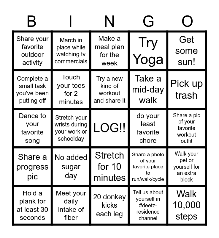 This bingo card has a free space and 24 words: No added sugar day, Meet your daily intake of fiber, Try a new kind of workout and share it, Hold a plank for at least 30 seconds, Get some sun!, Share your favorite outdoor activity, Complete a small task you've been putting off, March in place while watching tv commercials, do your least favorite chore, Stretch for 10 minutes, Take a mid-day walk, Dance to your favorite song, Share a photo of your favorite place to run/walk/cycle, Walk your pet or yourself for an extra block, Touch your toes for 2 minutes, Tell us about yourself in #deetz-residence channel, Share a pic of your favorite workout outfit, Make a meal plan for the week, Pick up trash, Stretch your wrists during your work or schoolday, Walk 10,000 steps, Share a progress pic, Try Yoga and 20 donkey kicks each leg.