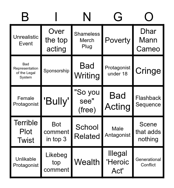 This bingo card has a free space and 24 words: Bot comment in top 3, Likebeg top comment, Bad Writing, Unlikable Protagonist, Dhar Mann Cameo, Unrealistic Event, Bad Representation of the Legal System, Over the top acting, Bad Acting, School Related, Protagonist under 18, Female Protagonist, Male Antagonist, Scene that adds nothing, Sponsorship, Illegal 'Heroic Act', Flashback Sequence, Shameless Merch Plug, Cringe, 'Bully', Generational Conflict, Terrible Plot Twist, Poverty and Wealth.