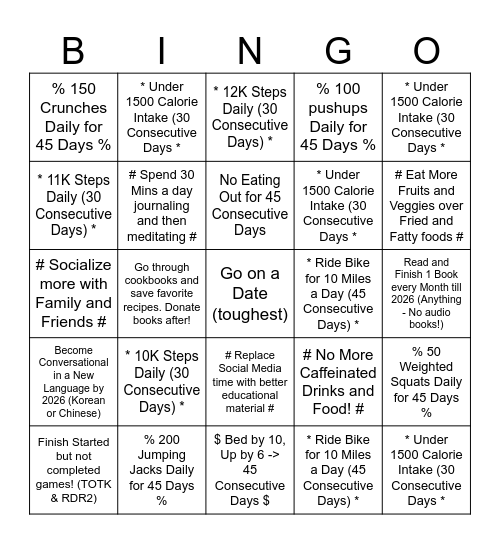 This bingo card has a free space and 24 words: * 10K Steps Daily (30 Consecutive Days) *, % 200 Jumping Jacks Daily for 45 Days %, No Eating Out for 45 Consecutive Days, Finish Started but not completed games! (TOTK & RDR2), * Under 1500 Calorie Intake (30 Consecutive Days *, % 150 Crunches Daily for 45 Days %, * 11K Steps Daily (30 Consecutive Days) *, * Under 1500 Calorie Intake (30 Consecutive Days *, * Ride Bike for 10 Miles a Day (45 Consecutive Days) *, # Replace Social Media time with better educational material #, * Under 1500 Calorie Intake (30 Consecutive Days *, # Socialize more with Family and Friends #, # No More Caffeinated Drinks and Food! #, % 50 Weighted Squats Daily for 45 Days %, # Spend 30 Mins a day journaling and then meditating #, * Ride Bike for 10 Miles a Day (45 Consecutive Days) *, Read and Finish 1 Book every Month till 2026 (Anything - No audio books!), * 12K Steps Daily (30 Consecutive Days) *, # Eat More Fruits and Veggies over Fried and Fatty foods #, Go through cookbooks and save favorite recipes. Donate books after!, * Under 1500 Calorie Intake (30 Consecutive Days *, Become Conversational in a New Language by 2026 (Korean or Chinese), % 100 pushups Daily for 45 Days % and $ Bed by 10, Up by 6 -> 45 Consecutive Days $.