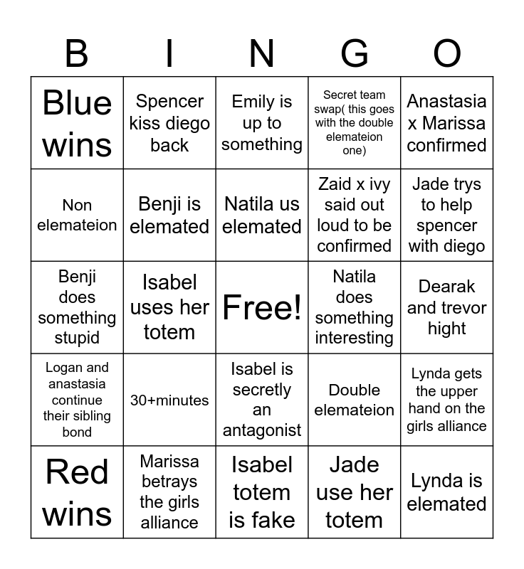 This bingo card has a free space and 24 words: 30+minutes, Marissa betrays the girls alliance, Natila us elemated, Red wins, Anastasia x Marissa confirmed, Blue wins, Non elemateion, Spencer kiss diego back, Natila does something interesting, Isabel is secretly an antagonist, Zaid x ivy said out loud to be confirmed, Benji does something stupid, Double elemateion, Lynda gets the upper hand on the girls alliance, Benji is elemated, Jade use her totem, Dearak and trevor hight, Emily is up to something, Jade trys to help spencer with diego, Isabel uses her totem, Lynda is elemated, Logan and anastasia continue their sibling bond, Secret team swap( this goes with the double elemateion one) and Isabel totem is fake.