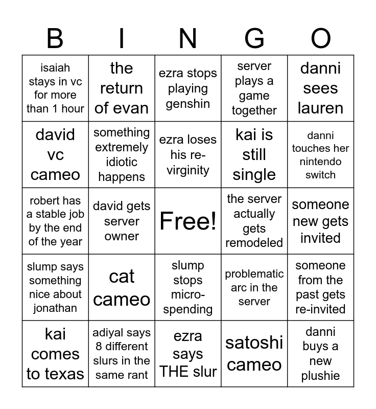 This bingo card has a free space and 24 words: cat cameo, adiyal says 8 different slurs in the same rant, ezra loses his re-virginity, kai comes to texas, danni sees lauren, isaiah stays in vc for more than 1 hour, david vc cameo, the return of evan, the server actually gets remodeled, slump stops micro-spending, kai is still single, robert has a stable job by the end of the year, problematic arc in the server, someone from the past gets re-invited, something extremely idiotic happens, satoshi cameo, someone new gets invited, ezra stops playing genshin, danni touches her nintendo switch, david gets server owner, danni buys a new plushie, slump says something nice about jonathan, server plays a game together and ezra says THE slur.