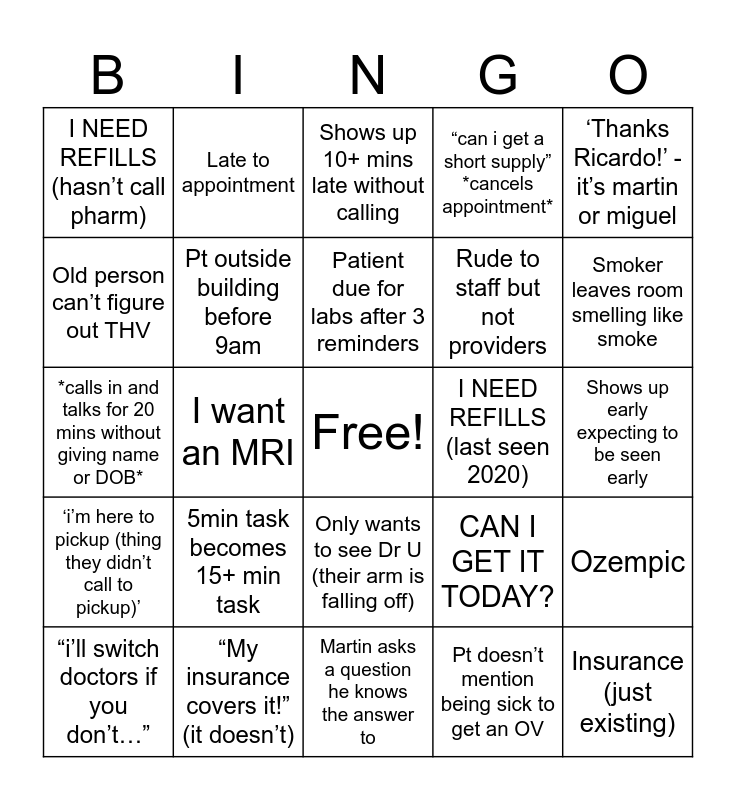 This bingo card has a free space and 24 words: 5min task becomes 15+ min task, “My insurance covers it!” (it doesn’t), Patient due for labs after 3 reminders, “i’ll switch doctors if you don’t…”, ‘Thanks Ricardo!’ -it’s martin or miguel, I NEED REFILLS (hasn’t call pharm), Old person can’t figure out THV, Late to appointment, I NEED REFILLS (last seen 2020), Only wants to see Dr U (their arm is falling off), Rude to staff but not providers, *calls in and talks for 20 mins without giving name or DOB*, CAN I GET IT TODAY?, Ozempic, Pt outside building before 9am, Pt doesn’t mention being sick to get an OV, Shows up early expecting to be seen early, Shows up 10+ mins late without calling, Smoker leaves room smelling like smoke, I want an MRI, Insurance (just existing), ‘i’m here to pickup (thing they didn’t call to pickup)’, “can i get a short supply” *cancels appointment* and Martin asks a question he knows the answer to.