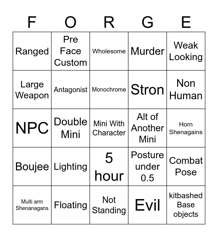 This bingo card has a free space and 64 words: Edgy, Wings/Tails, Kitbashing, Combat Pose, Protagonist, Basic, Pre Face Custom, Strong, Monochrome, Undead/Lifeless, 5 hour, Colorful, Horn Shenagains, Weak Looking, Melee, Large Weapon, Double Mini, Ranged, Magic Effects, Stron, Lighting, Boujee, Murder, 5 min, Tall Above Average, Weapon Bashing, Looks old, Looks Young, Ancient, Wants to kill you, Over the top posing, Mary Sue Looking, Head Accessory, Non Natural Hair Color, Non Human, Multi arm Shenanagans, Good, Evil, Antihero, Antagonist, NPC, Alt of Another Mini, Short Below Average, Sand Base, Grass Base, kitbashed Base objects, Floating, Stoopid face, Posture under 0.5, Nice, Weak, Neutral, Not Standing, Unprintable, Ugly, Smash, Wholesome, Ancient Mini, Sci-fi, Horror, Eye Glow, Black Sclera, Bashed Limit and Lags.
