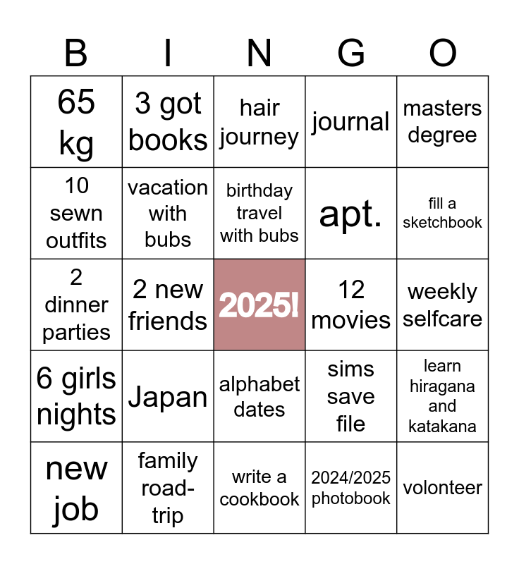 This bingo card has a free space and 24 words: Japan, family road-trip, birthday travel with bubs, new job, masters degree, 65 kg, 10 sewn outfits, 3 got books, 12 movies, alphabet dates, apt., 2 dinner parties, sims save file, learn hiragana and katakana, vacation with bubs, 2024/2025 photobook, weekly selfcare, hair journey, fill a sketchbook, 2 new friends, volonteer, 6 girls nights, journal and write a cookbook.