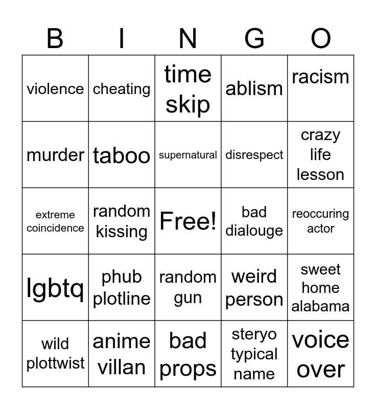This bingo card has a free space and 24 words: phub plotline, anime villan, supernatural, wild plottwist, racism, violence, murder, cheating, bad dialouge, random gun, disrespect, extreme coincidence, weird person, sweet home alabama, taboo, steryo typical name, reoccuring actor, time skip, crazy life lesson, random kissing, voice over, lgbtq, ablism and bad props.
