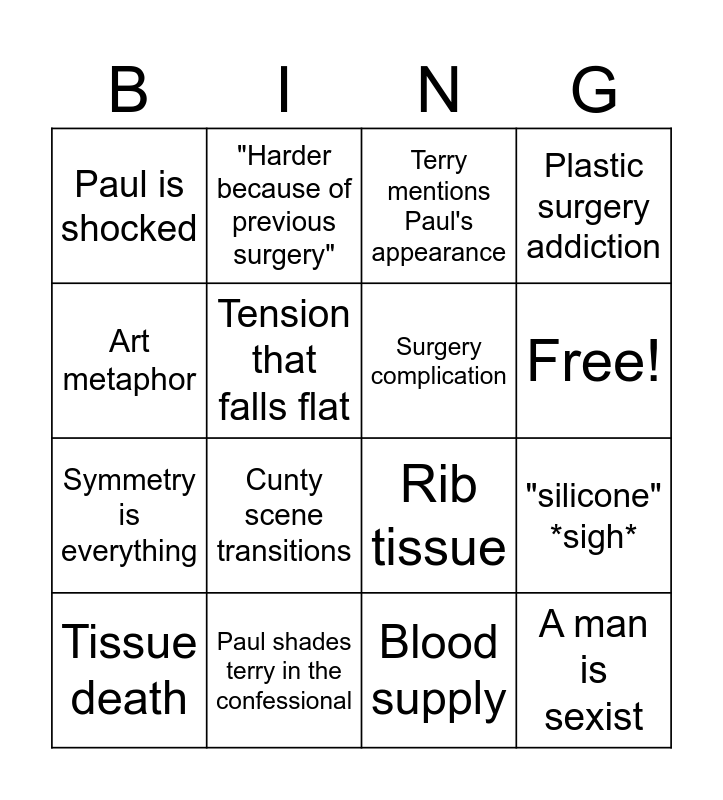 This bingo card has 17 words: Blood supply, Tissue death, Terry mentions Paul's appearance, Paul is shocked, Cunty scene transitions, Plastic surgery addiction, "silicone" *sigh*, Surgery complication, Free!, Tension that falls flat, Paul shades terry in the confessional, Rib tissue, Art metaphor, "Harder because of previous surgery", Symmetry is everything, "we are not out of the woods" and A man is sexist.