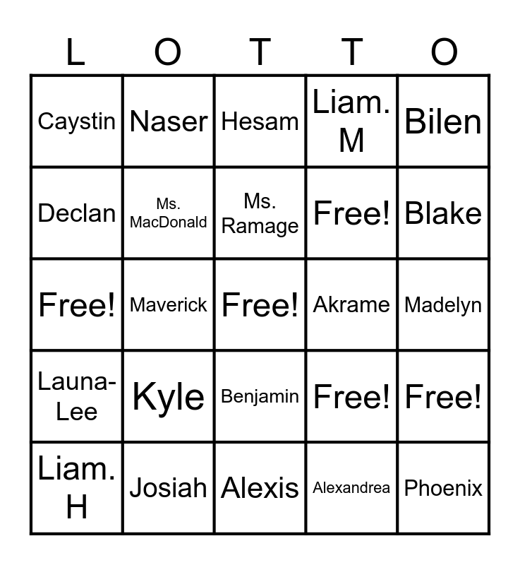 This bingo card has a free space and 24 words: Kyle, Josiah, Ms. Ramage, Liam. H, Bilen, Caystin, Declan, Naser, Akrame, Benjamin, Free!, Free!, Free!, Free!, Ms. MacDonald, Alexandrea, Madelyn, Hesam, Blake, Maverick, Phoenix, Launa-Lee, Liam. M and Alexis.