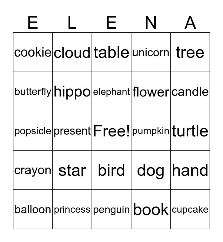 This bingo card has a free space and 24 words: star, princess, elephant, balloon, tree, cookie, butterfly, cloud, pumpkin, bird, flower, popsicle, dog, hand, hippo, book, turtle, table, candle, present, cupcake, crayon, unicorn and penguin.