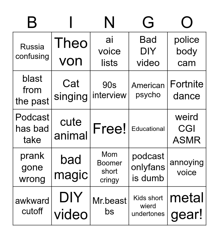 This bingo card has a free space and 44 words: Talking with gta 5 content, metal gear!, Joe Rogan laughs at non joke, awkward cutoff, Goyim, Kids short wierd undertones, ai voice lists, hoodlum activity, police body cam, DIY video, Bad DIY video, Educational, Mom Boomer short cringy, bad magic, African Comedy Skit, Mr.beast bs, random alpha male shi, Podcast has bad take, a clip of an existing video, Fortnite dance, Theo von, Trump impersonation, complaining about trump, Russia confusing, weird facts that arent true, weird CGI ASMR, Weird ASMR, tv show short half the episode, podcast onlyfans is dumb, prank gone wrong, prank gone right, annoying voice, short of a short of a short, Ai song using cartoon, cute animal, selling something annoyingly, Hey whats up you guys, speed up, 90s interview, blast from the past, American psycho, Cat dancing, Cat singing and Cat Spinning.