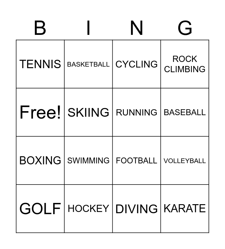 This bingo card has 16 words: HOCKEY, VOLLEYBALL, CYCLING, TENNIS, BOXING, BASKETBALL, FOOTBALL, DIVING, Free!, SKIING, GOLF, ROCK CLIMBING, SWIMMING, BASEBALL, RUNNING and KARATE.
