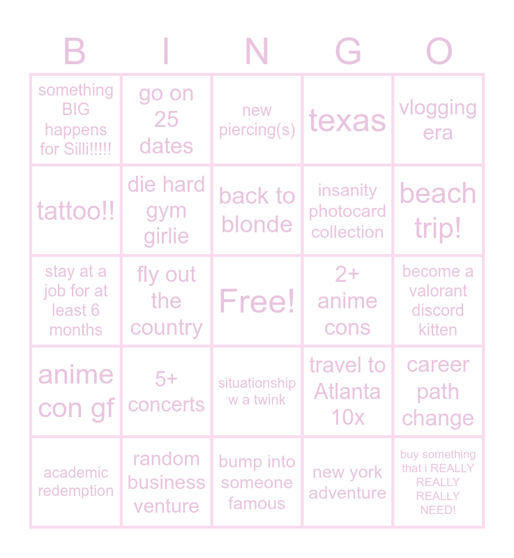 This bingo card has a free space and 24 words: 5+ concerts, random business venture, back to blonde, academic redemption, vlogging era, something BIG happens for Silli!!!!!, tattoo!!, go on 25 dates, 2+ anime cons, situationship w a twink, insanity photocard collection, stay at a job for at least 6 months, travel to Atlanta 10x, career path change, die hard gym girlie, new york adventure, become a valorant discord kitten, new piercing(s), beach trip!, fly out the country, buy something that i REALLY REALLY REALLY NEED!, anime con gf, texas and bump into someone famous.
