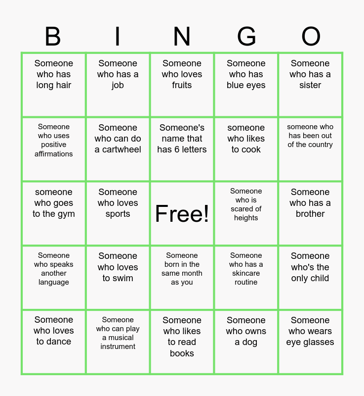 This bingo card has a free space and 29 words: Someone who loves to dance, Someone who is afraid of spiders, Someone who loves sports, Someone who is left handed, Someone who has long hair, Someone who loves fruits, Someone who can do a cartwheel, Someone who loves to swim, Someone who is scared of heights, Someone who can play a musical instrument, Someone who has a brother, Someone who wears eye glasses, Someone who likes to read books, Someone who owns a dog, someone who has been out of the country, Someone who owns a cat, Someone born in the same month as you, Someone who speaks another language, Someone who has a sister, someone who goes to the gym, Someone who has a skincare routine, someone who listens to music, someone who likes to cook, Someone who uses positive affirmations, Someone who has blue eyes, Someone who has a job, Someone who's the only child, Someone's name that has 6 letters and Someone who is wearing jeans.